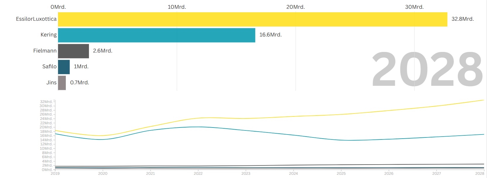 Umsatzwachstum und -prognose von EssilorLuxottica und Konkurrenten (2019-2028, in CHF)