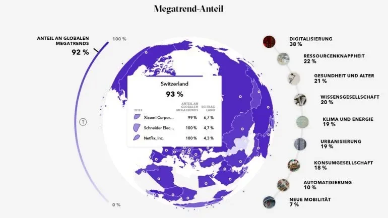 Das Tool ermöglicht eine umfassende und zugleich verständliche Analyse entlang zentraler Dimensionen wie Klimaerwärmungspotenzial, ökologischer und sozialer Footprint, Megatrend-Exponierung sowie finanzieller Performance.
